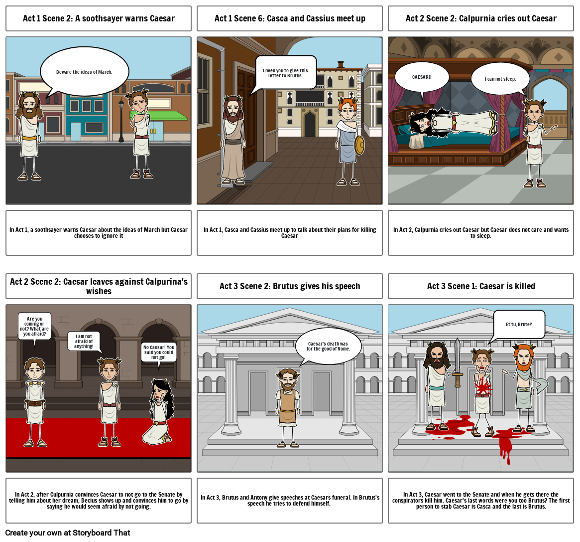 In Act 3, Caesar went to the Senate and when he gets there the conspirators kill him. Caesar's last words were you too Brutus? The first person to stab Caesar is Casca and the last is Brutus.