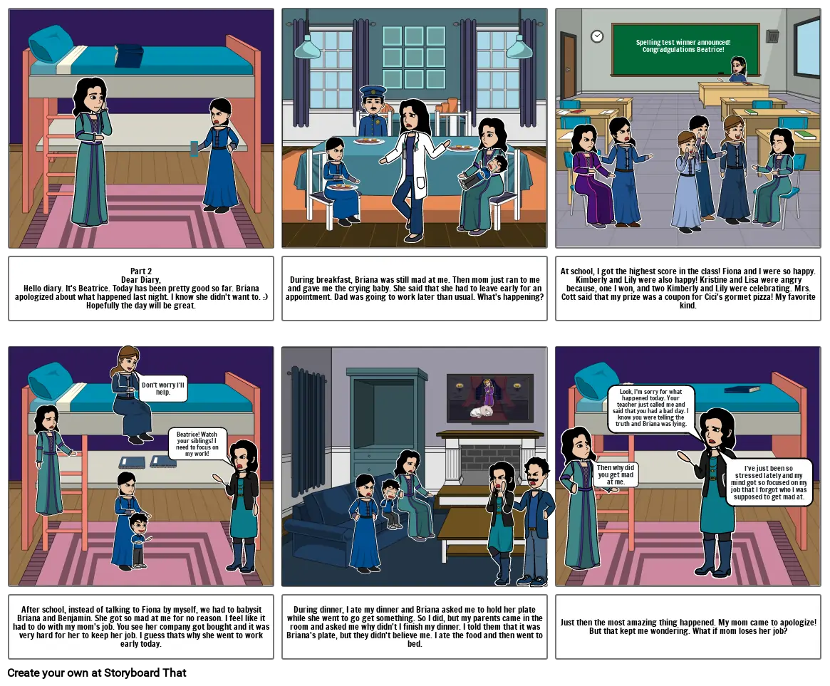 Part 2Dear Diary,Hello diary. It's Beatrice. Today has been pretty good so far. Briana apologized about what happened last night. I know she didn't want to. :) Hopefully the day will be great.