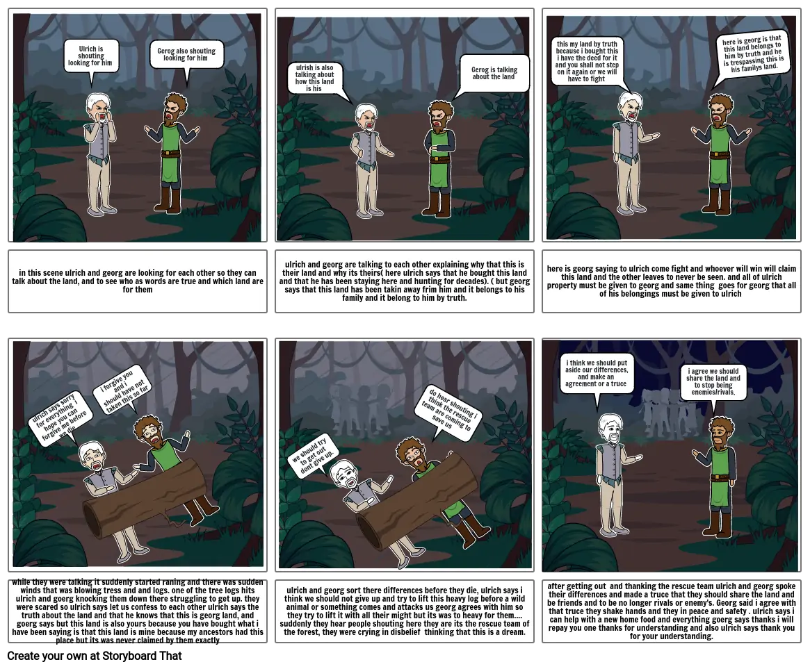 while they were talking it suddenly started raning and there was sudden winds that was blowing tress and and logs. one of the tree logs hits ulrich and goerg knocking them down there struggling to get up. they were scared so ulrich says let us confess to each other ulrich says the truth about the land and that he knows that this is georg land, and goerg says but this land is also yours because you have bought what i have been saying is that this land is mine because my ancestors had this place but its was never claimed by them exactly