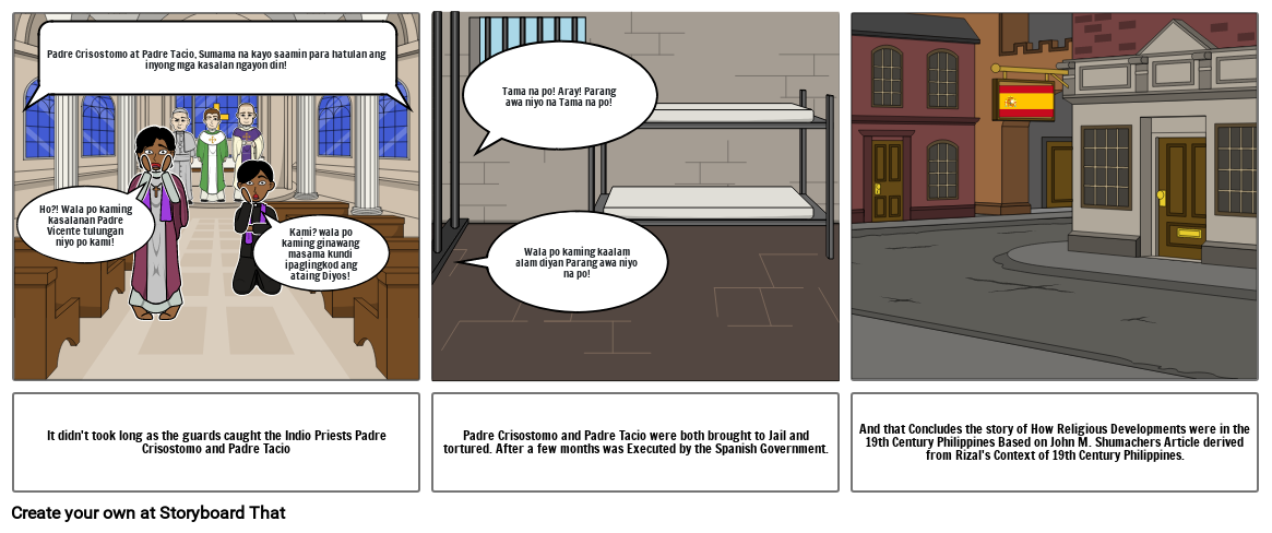 Padre Crisostomo and Padre Tacio were both brought to Jail and tortured. After a few months was Executed by the Spanish Government.