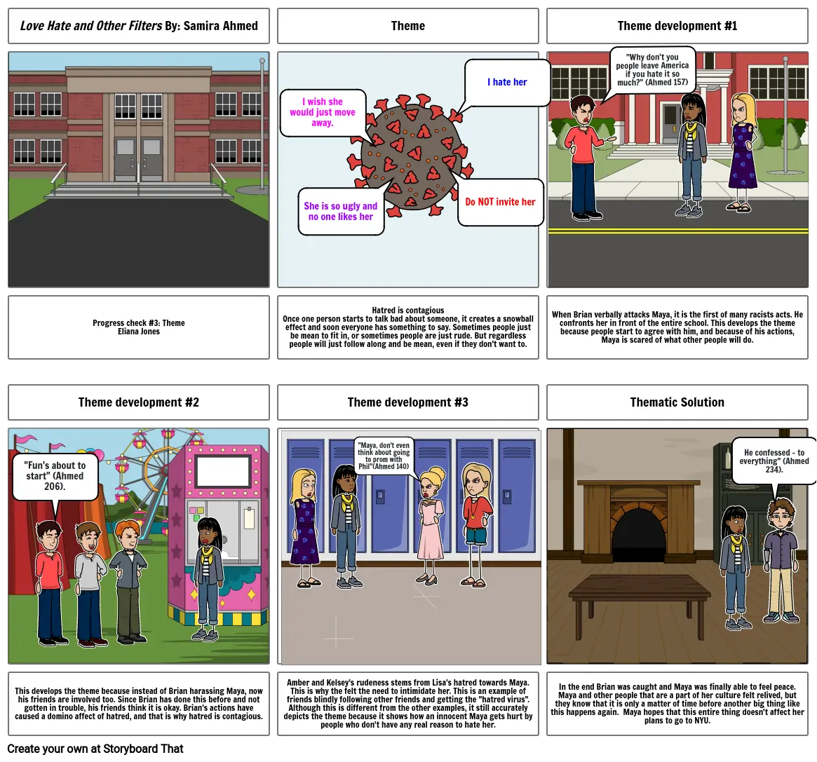 This develops the theme because instead of Brian harassing Maya, now his friends are involved too. Since Brian has done this before and not gotten in trouble, his friends think it is okay. Brian's actions have caused a domino affect of hatred, and that is why hatred is contagious.