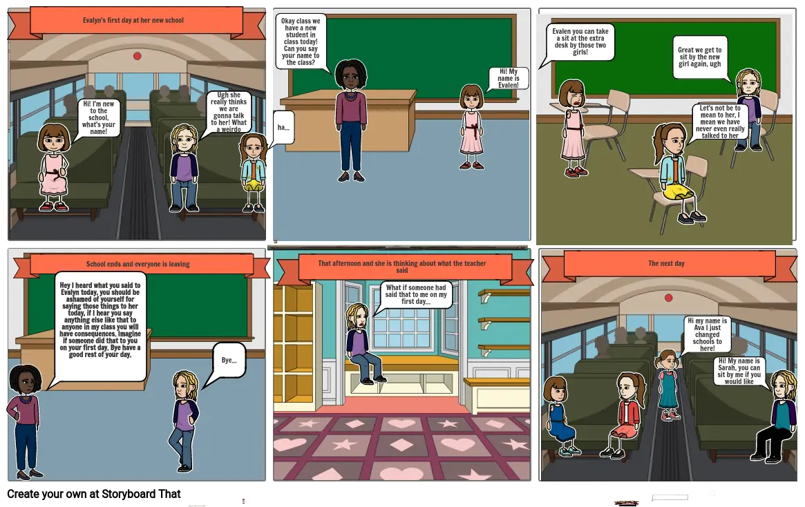 Hey I heard what you said to Evalyn today, you should be ashamed of yourself for saying those things to her today, if I hear you say anything else like that to anyone in my class you will have consequences. Imagine if someone did that to you on your first day. Bye have a good rest of your day.