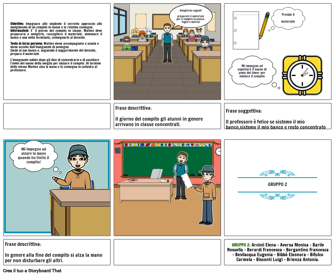 • Obiettivo: Insegnare allo studente il corretto approccio allo svolgimento di un compito in classe e la relativa consegna.Informazioni: E’ il giorno del compito in classe, Matteo deve prepararsi a svolgerlo, raccogliere il materiale, sistemare il banco e una volta terminato, consegnarlo al docente. Testo in terza persona: Matteo viene accompagnato a scuola e viene accolto dall’insegnante di sostegno.Siede al suo banco e, seguendo il suggerimento del docente, prepara il materiale.L’insegnante subito dopo gli dice di concentrarsi e di ascoltare l’avvio del suono della sveglia per iniziare il compito. Al termine dello stesso Matteo alza la mano e lo consegna in cattedra al professore.