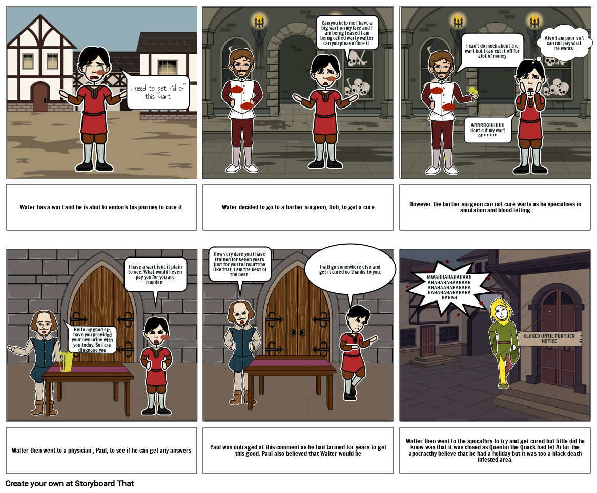 Walter then went to the apocathry to try and get cured but little did he know was that it was closed as Quentin the Quack had let Artur the apocracthy believe that he had a holiday but it was too a black death infested area.