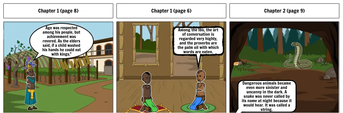This connects with the language theme because it reflects how the Igbo clan would always have a hierarchy with the elders and teach the younger people how to respect elders by telling them proverbs from their history.
