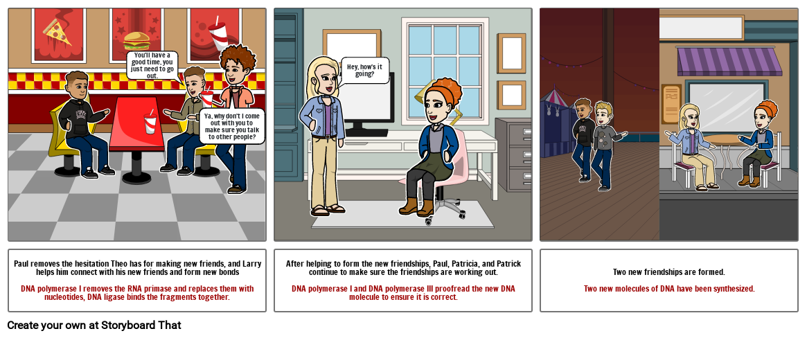 After helping to form the new friendships, Paul, Patricia, and Patrick continue to make sure the friendships are working out.DNA polymerase I and DNA polymerase III proofread the new DNA molecule to ensure it is correct.
