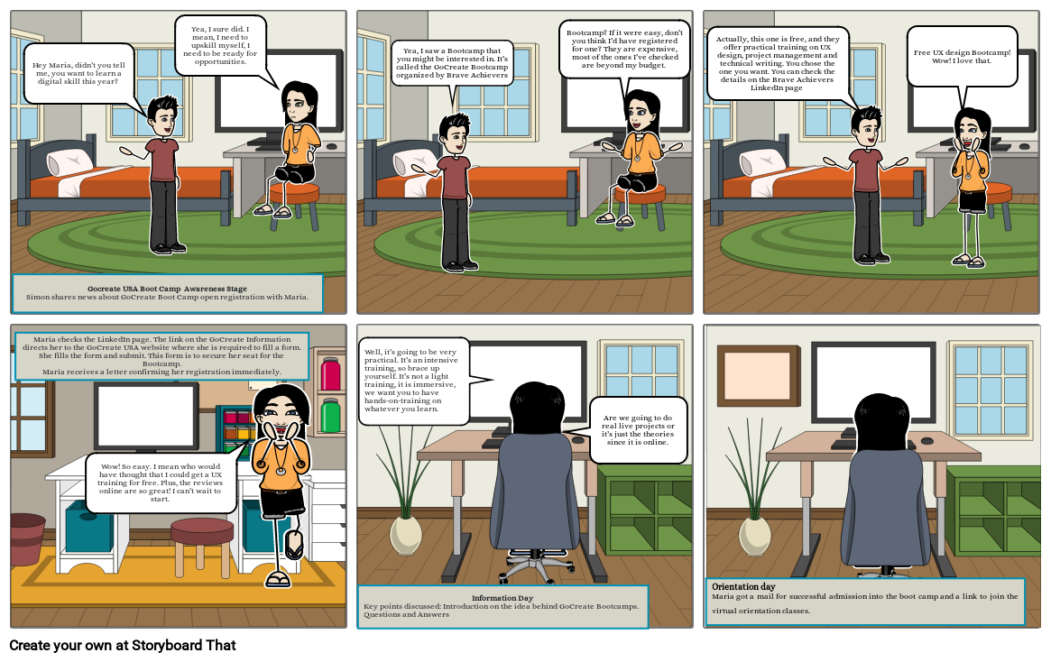 Maria checks the LinkedIn page. The link on the GoCreate Information directs her to the GoCreate USA website where she is required to fill a form. She fills the form and submit. This form is to secure her seat for the Bootcamp. Maria receives a letter confirming her registration immediately.