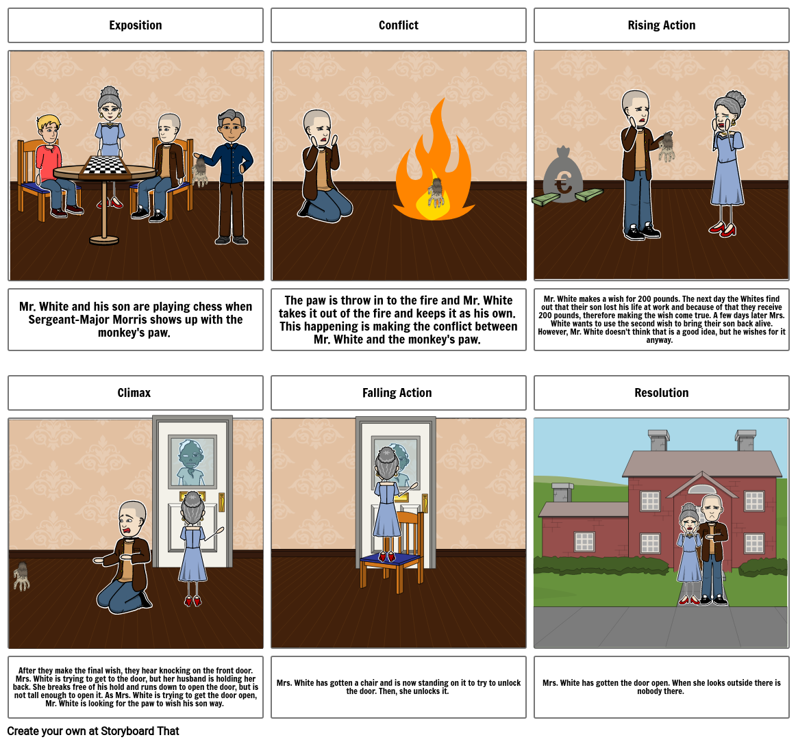 The paw is throw in to the fire and Mr. White takes it out of the fire and keeps it as his own. This happening is making the conflict between Mr. White and the monkey's paw.