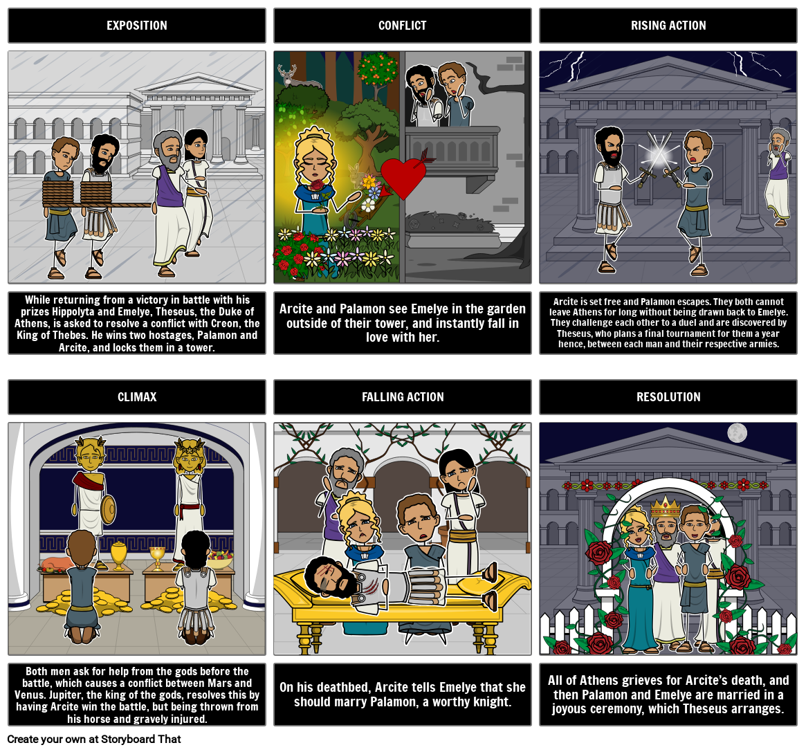 While returning from a victory in battle with his prizes Hippolyta and Emelye, Theseus, the Duke of Athens, is asked to resolve a conflict with Creon, the King of Thebes. He wins two hostages, Palamon and Arcite, and locks them in a tower.