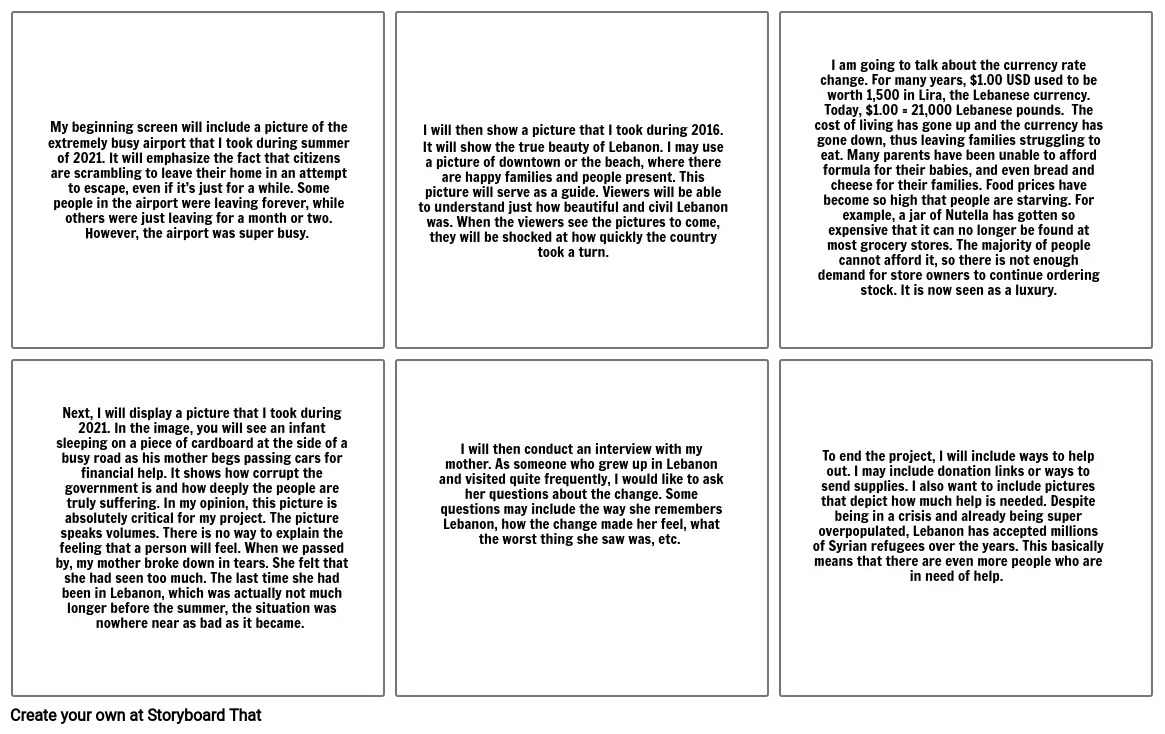 I will then conduct an interview with my mother. As someone who grew up in Lebanon and visited quite frequently, I would like to ask her questions about the change. Some questions may include the way she remembers Lebanon, how the change made her feel, what the worst thing she saw was, etc.