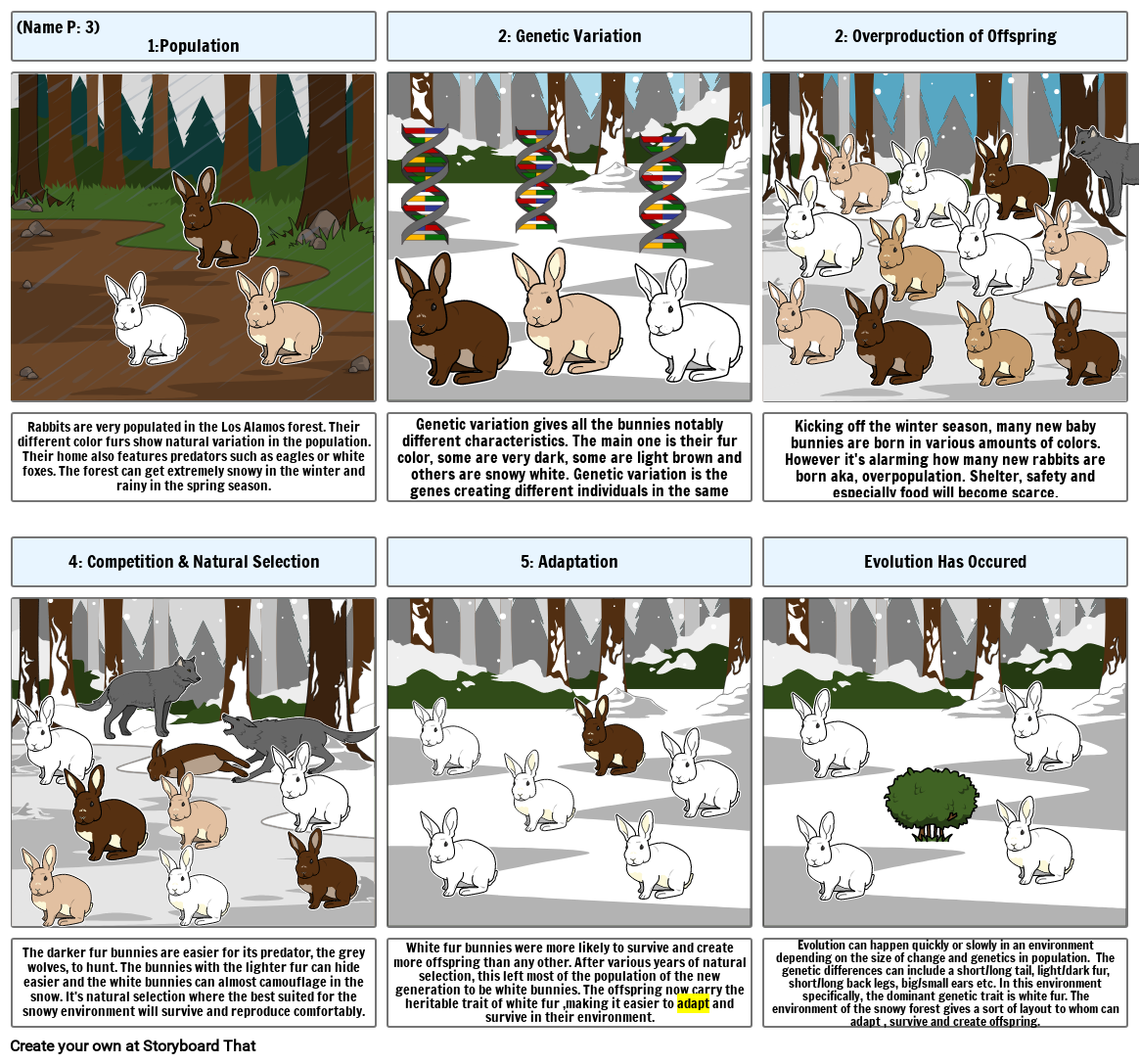 Evolution can happen quickly or slowly in an environment depending on the size of change and genetics in population. The genetic differences can include a short/long tail, light/dark fur, short/long back legs, big/small ears etc. In this environment specifically, the dominant genetic trait is white fur. The environment of the snowy forest gives a sort of layout to whom can adapt , survive and create offspring.