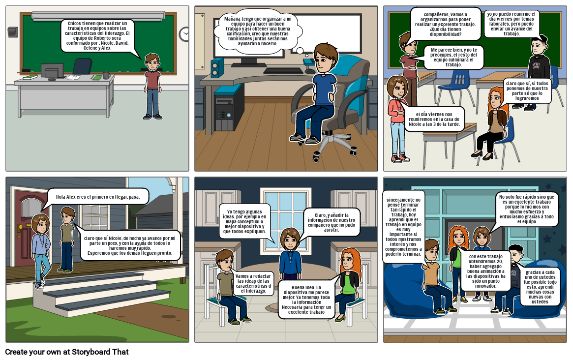 Chicos tienen que realizar un trabajo en equipos sobre las características del liderazgo. El equipo de Roberto será conformado por , Nicole, David, Celene y Alex