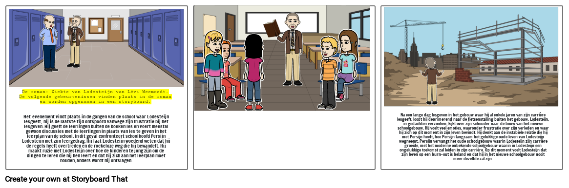 De roman: Ziekte van Lodesteijn van Lévi Weemoedt. De volgende gebeurtenissen vinden plaats in de roman en worden opgenomen in een storyboard.