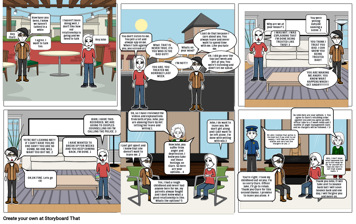 So John here are your options. 1. You agree to Clare's retraining order against you and you agree go with officer Jake to a 3 week rehab and 3 months of anger management class and no chargers will be followed. ( 1)