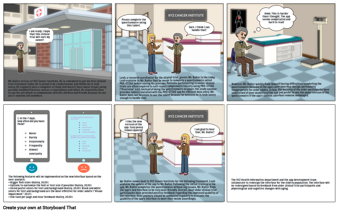 Mr. Buller comes back to XYZ Cancer Institute for the following treatment. Leah explains the update of the app to Mr. Buller. Following the initial training in the app, Mr. Buller completes the questionnaire without any issues. Mr. Buller finds the app’s new interface to be very user-friendly. Overall, most older clinical trial participants have provided positive feedback regarding the improved usability of the interface. User analysis should be conducted regularly to evaluate the usability of the app’s interface to meet their needs accordingly.