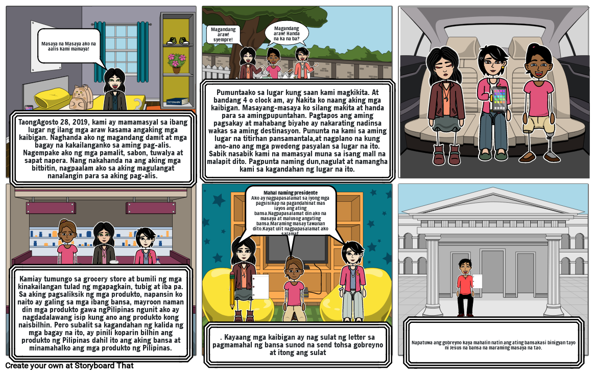 Kamiay tumungo sa grocery store at bumili ng mga kinakailangan tulad ng mgapagkain, tubig at iba pa. Sa aking pagsaliksik ng mga produkto, napansin ko naito ay galing sa mga ibang bansa, mayroon naman din mga produkto gawa ngPilipinas ngunit ako ay nagdadalawang isip kung ano ang produkto kong naisbilhin. Pero subalit sa kagandahan ng kalida ng mga bagay na ito, ay pinili koparin bilhin ang produkto ng Pilipinas dahil ito ang aking bansa at minamahalko ang mga produkto ng Pilipinas.