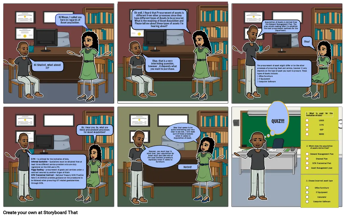 The procurement of asset might differ or be like other processes of procuring Good and service, however it only depends on the type of asset you want to procure. These types of Assets include: Office Furniture IT Equipment Computer Software