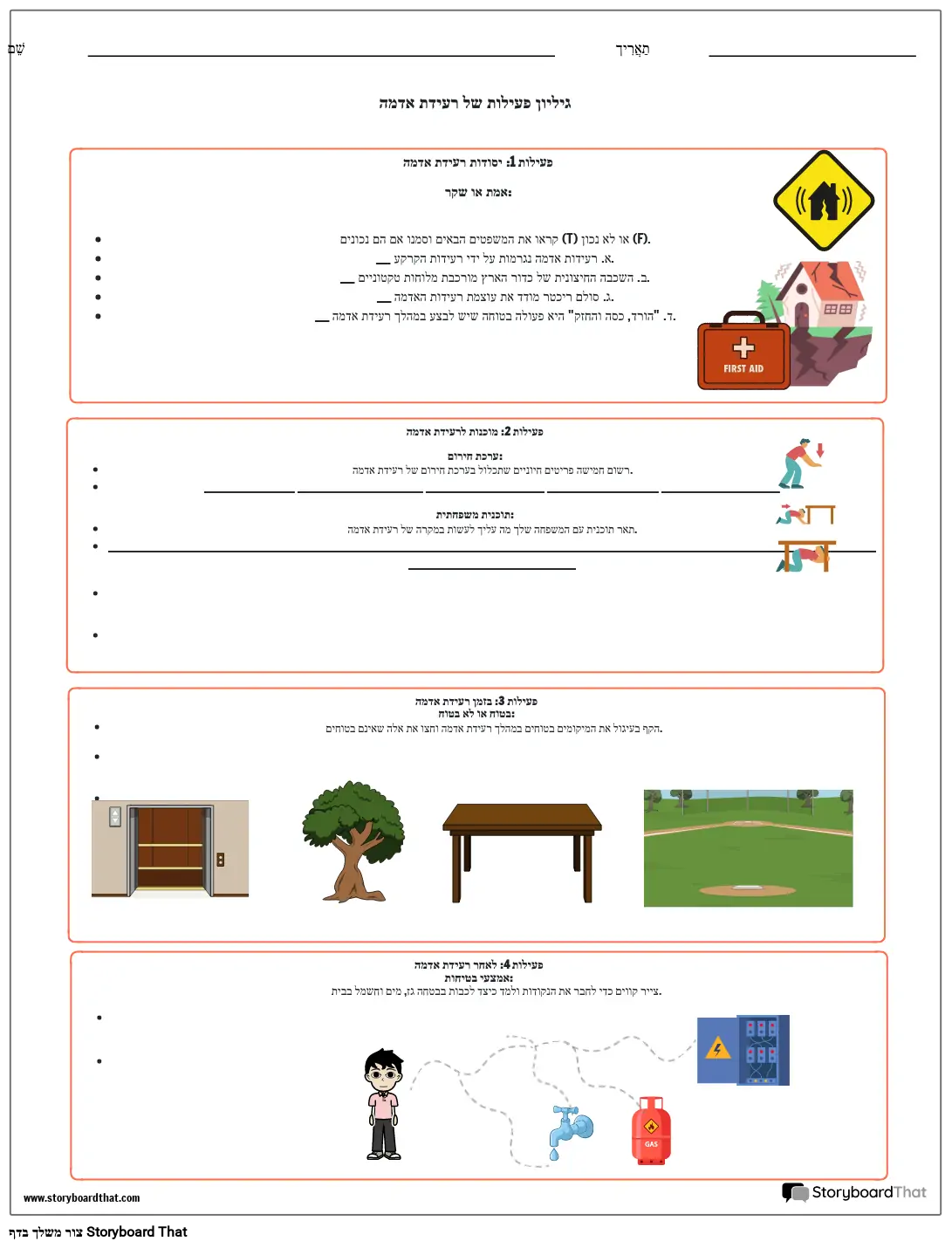 פעילות 2: מוכנות לרעידת אדמה ערכת חירום: רשום חמישה פריטים חיוניים שתכלול בערכת חירום של רעידת אדמה. __________________________ ____________________________________ __________________________________ ________________________________ __________________________________ תוכנית משפחתית: תאר תוכנית עם המשפחה שלך מה עליך לעשות במקרה של רעידת אדמה. ____________________________________________________________________________________________________________________________________________________________________________________________________________________________________________________________________________