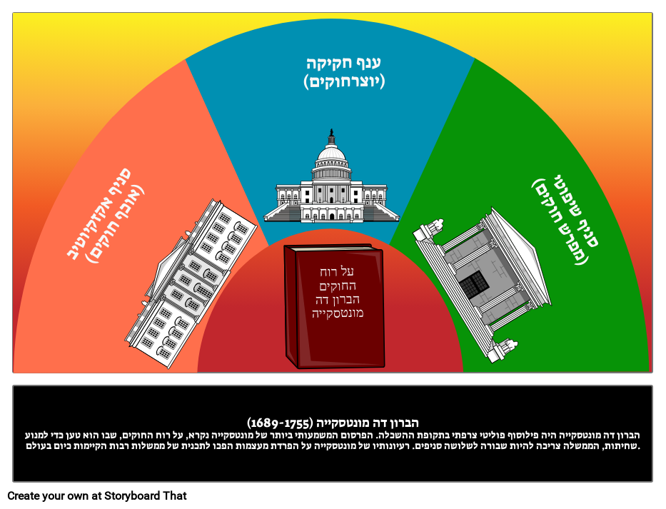 הברון דה מונטסקייה (1689-1755) הברון דה מונטסקייה היה פילוסוף פוליטי צרפתי בתקופת ההשכלה. הפרסום המשמעותי ביותר של מונטסקייה נקרא, על רוח החוקים, שבו הוא טען כדי למנוע שחיתות, הממשלה צריכה להיות שבורה לשלושה סניפים. רעיונותיו של מונטסקייה על הפרדת מעצמות הפכו לתכנית של ממשלות רבות הקיימות כיום בעולם.