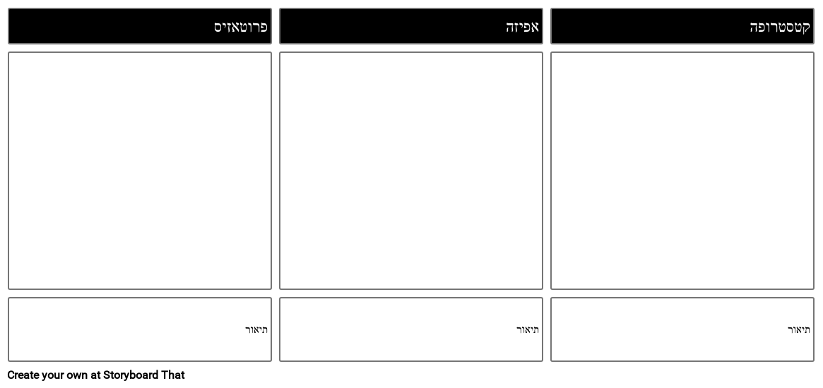 תבנית מבנה מעשה הורה לתלמידים לזהות את המחלה, האפיטזיס והקטסטרופה של המחזה, ותאר אותם באמצעות Storyboard That.