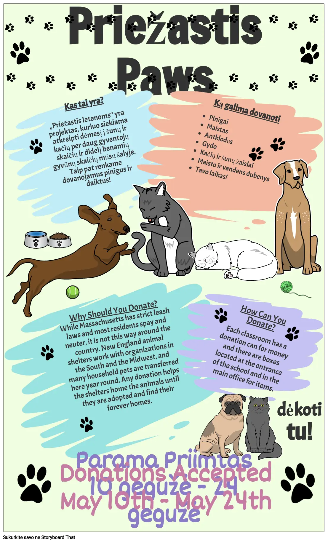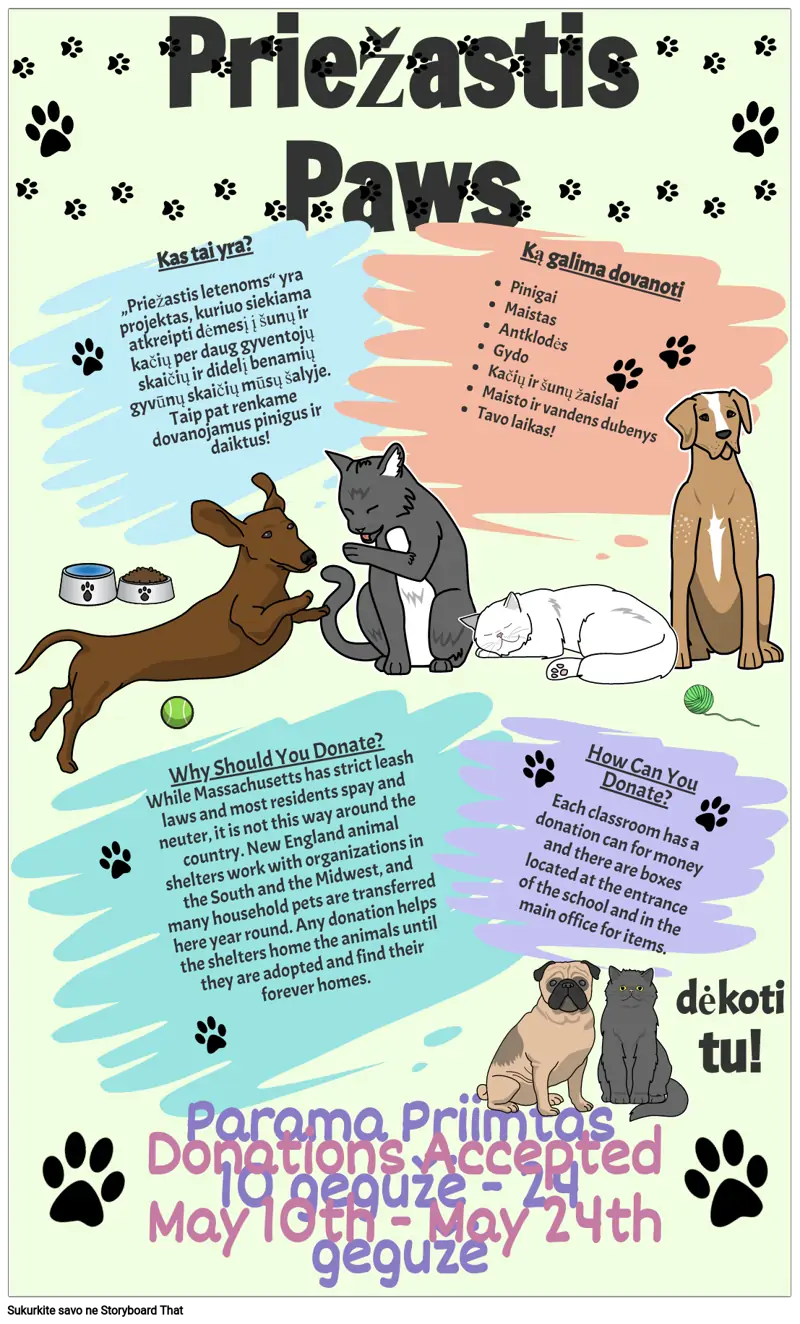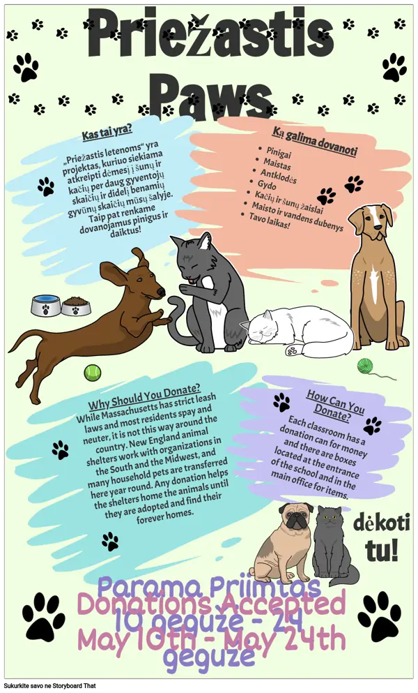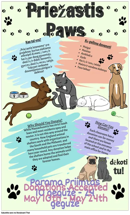 Kas tai yra? „Priežastis letenoms“ yra projektas, kuriuo siekiama atkreipti dėmesį į šunų ir kačių per daug gyventojų skaičių ir didelį benamių gyvūnų skaičių mūsų šalyje. Taip pat renkame dovanojamus pinigus ir daiktus!