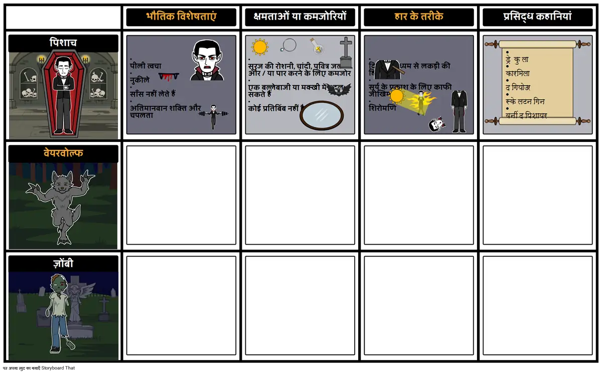 एक ग्रिड बनाएं जो प्रसिद्ध राक्षसों और पौराणिक जानवरों की विशेषताओं को दर्शाता है। उनकी विशेषताओं, क्षमताओं और कमजोरियों, उन्हें हराने के तरीके और उनसे जुड़ी प्रसिद्ध कहानियों को शामिल करें।