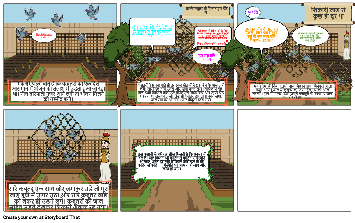 सारे कबूतर एक साथ जोर लगाकर उडे तो पूरा जाल हवा में ऊपर उठा और सारे कबूतर जाल को लेकर ही उडने लगे। कबूतरों को जाल सहित उडते देखकर शिकारी अवाक रह गया।