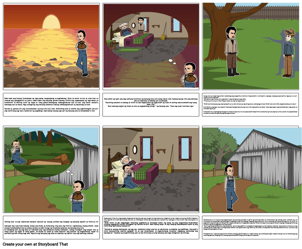 Baku-bako ang lupang tinatapakan ng mga paang nangangatog sa paghakbang. Mula sa kunot na nuo ay utay-utay na umanod ang ganggabutil na pawis. Lakad-takbo ang kanyang ginawa habang tinitiis ang pagkangalay ng mga kamay na bumibitbit sa konting butil ng bigas at ilang gamot.Kailangang makipaghabulan siya sa oras, ang bawat sandali'y mahalaga para sa kanya. Nag-uumagting ang kanyang kalamnan habang nakikipaghabulan sa papalubog na araw. Marahil ay ganoon din ang nararamdaman ng kuya Lito niya noon. Matinding poot sa dibdib ang naghihimagsik lalo pa't ang natitirang pag-asa'y nabahiran ng pagkabigo. kapirasong lupang pag-aari ng kanyang ama na kinakamkam ni Don