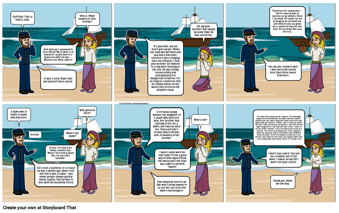 You seem like a good person, captain, and although people who look beautiful are often corrupt inside, I believe that you have a beautiful mind to go with your good looks and manner. Please--and I'll pay you plenty for this--help me conceal my identity, and find me the right disguise so I can look the way I want. I want to be the duke's servant. You'll introduce me to him as a eunuch. You won't be wasting your time, because I really can sing and talk to him about many different kinds of music, so he'll be happy to have me in his service. Only time will tell what will happen after that --just please keep quiet about what I'm trying to do.