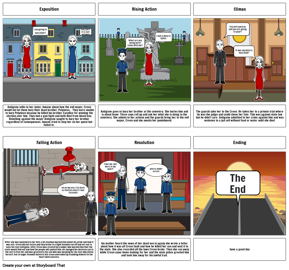 Antigone goes to bury her brother at the cemetery. She buries him and is about leave. Three cops roll up and ask her what she is doing in the cemetery. She admits to her actions and the guards bring her to the evil mayor, Creon and she awaits her punishment.