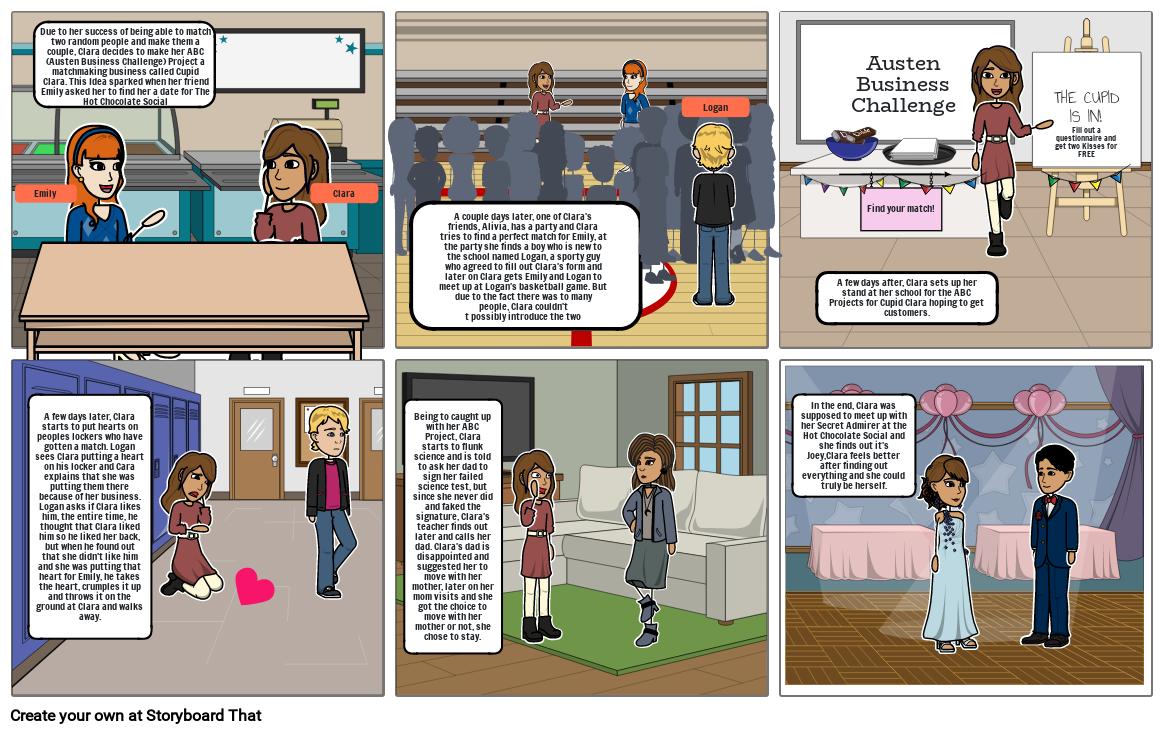 Due to her success of being able to match two random people and make them a couple, Clara decides to make her ABC (Austen Business Challenge) Project a matchmaking business called Cupid Clara. This Idea sparked when her friend Emily asked her to find her a date for The Hot Chocolate Social