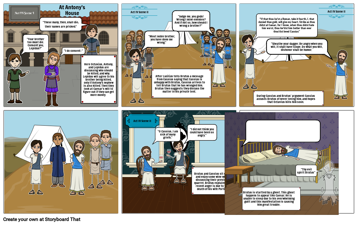 After Lucilius tells Brutus a message from Cassius saying that Cassius is unhappy with Brutus, Cassius arrives to tell Brutus that he has wronged him. Brutus then suggests they discuss the matter in his private tent.
