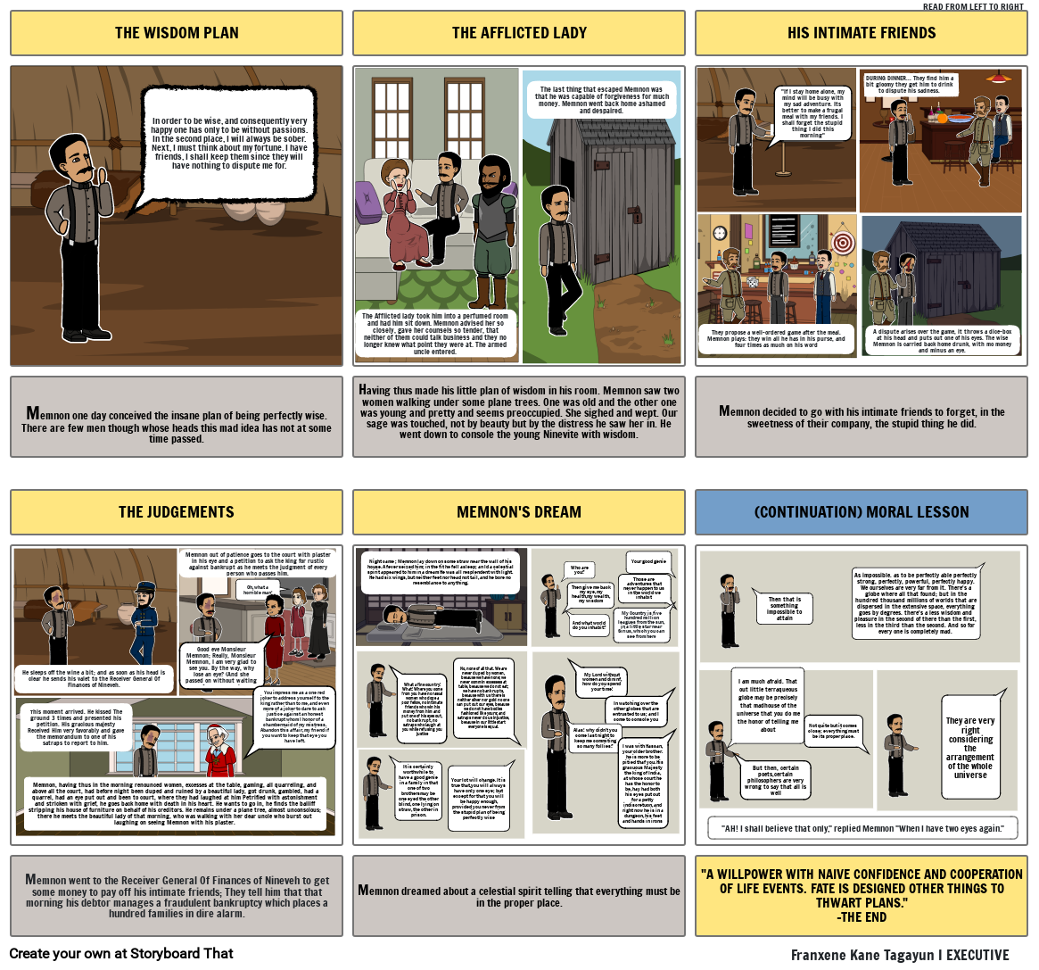 Memnon went to the Receiver General Of Finances of Nineveh to get some money to pay off his intimate friends; They tell him that that morning his debtor manages a fraudulent bankruptcy which places a hundred families in dire alarm.