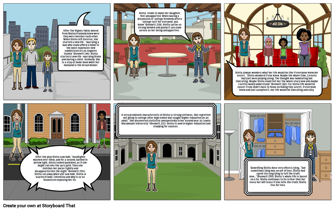 A very prominent characteristic of Stella is strong silliness. She regretted not going to college after high school but sought higher education as an adult,¨She discovered statistics unexpectedly in her second year at Loyola Marymount University¨(Bennett 221). Stella is now in higher education and studying for success.