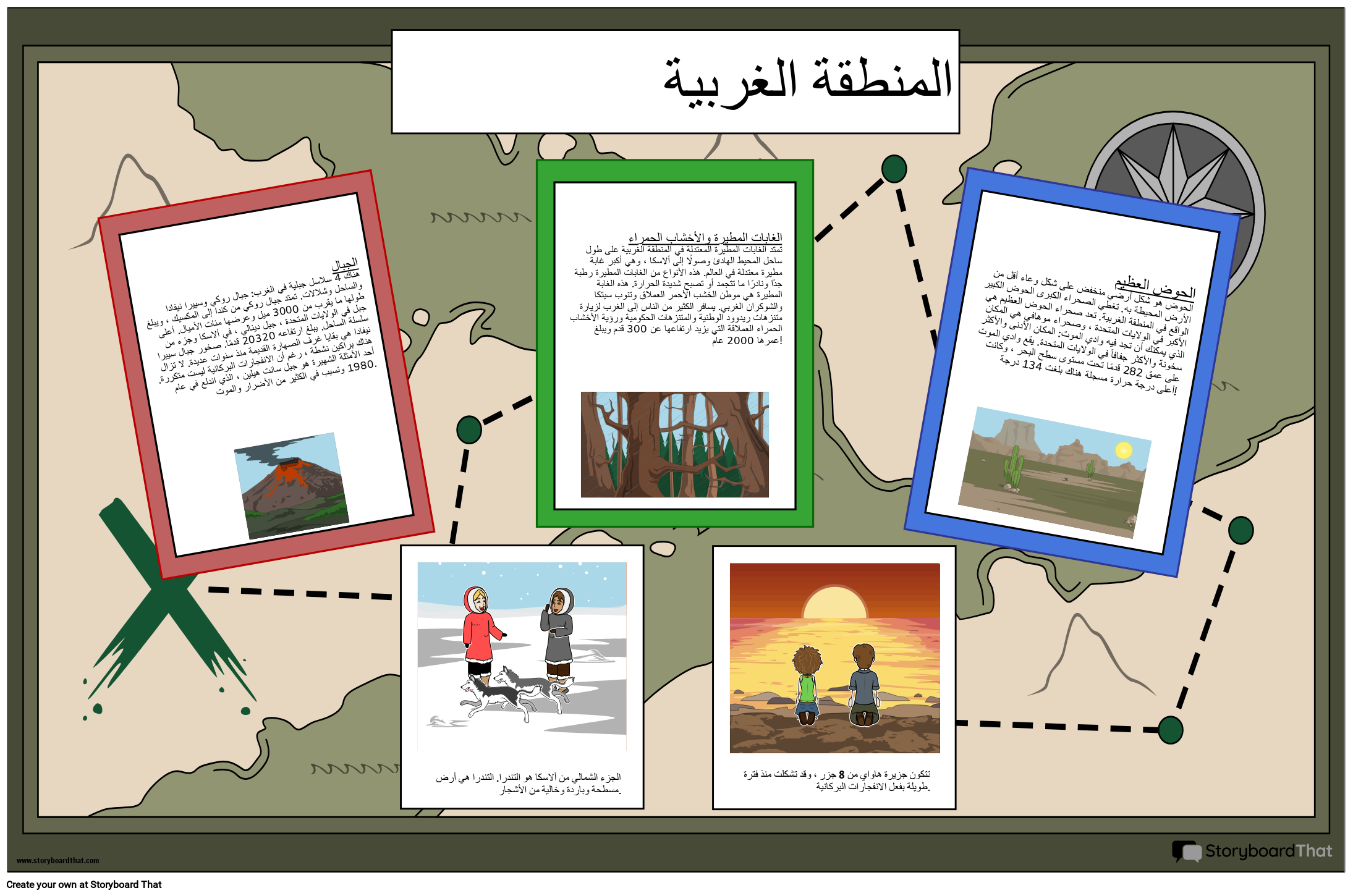 الغابات المطيرة والأخشاب الحمراء تمتد الغابات المطيرة المعتدلة في المنطقة الغربية على طول ساحل المحيط الهادئ وصولًا إلى ألاسكا ، وهي أكبر غابة مطيرة معتدلة في العالم. هذه الأنواع من الغابات المطيرة رطبة جدًا ونادرًا ما تتجمد أو تصبح شديدة الحرارة. هذه الغابة المطيرة هي موطن الخشب الأحمر العملاق وتنوب سيتكا والشوكران الغربي. يسافر الكثير من الناس إلى الغرب لزيارة متنزهات ريدوود الوطنية والمتنزهات الحكومية ورؤية الأخشاب الحمراء العملاقة التي يزيد ارتفاعها عن 300 قدم ويبلغ عمرها 2000 عام!