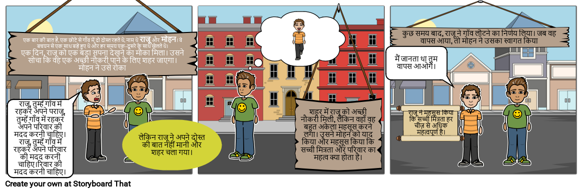 Once upon a time, in a small village, there lived two friends named Raju and Mohan. They had grown up together and played together all the time.One day, Raju got an opportunity to pursue a big dream. He thought he would go to the city to get a good job. Mohan stopped him