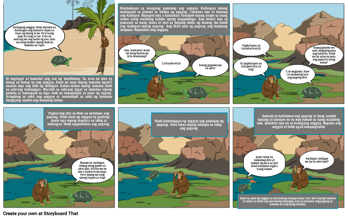 Hindi pinakinggan ng unggoy ang pakiusap ng pagong. Ubos lakas niyang inihagis sa tubig ang pagong.