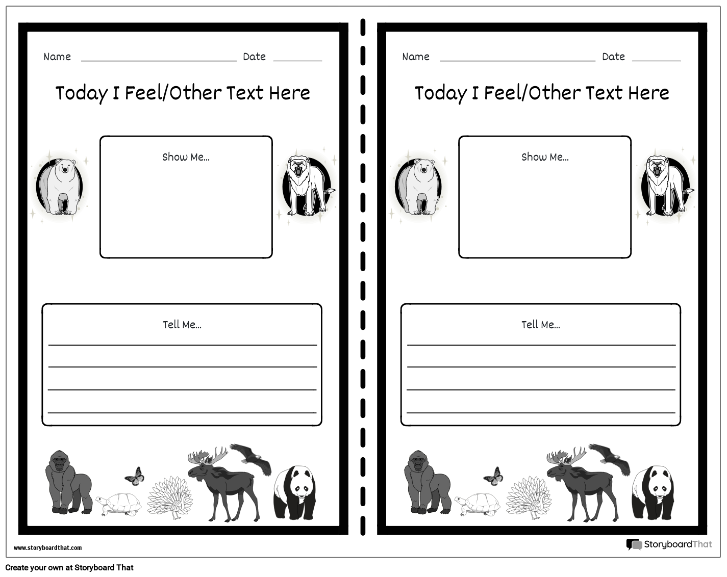 काले और सफेद परिदृश्य। एनिमल थीम्ड सोशल इमोशनल चेक-इन वर्कशीट।
