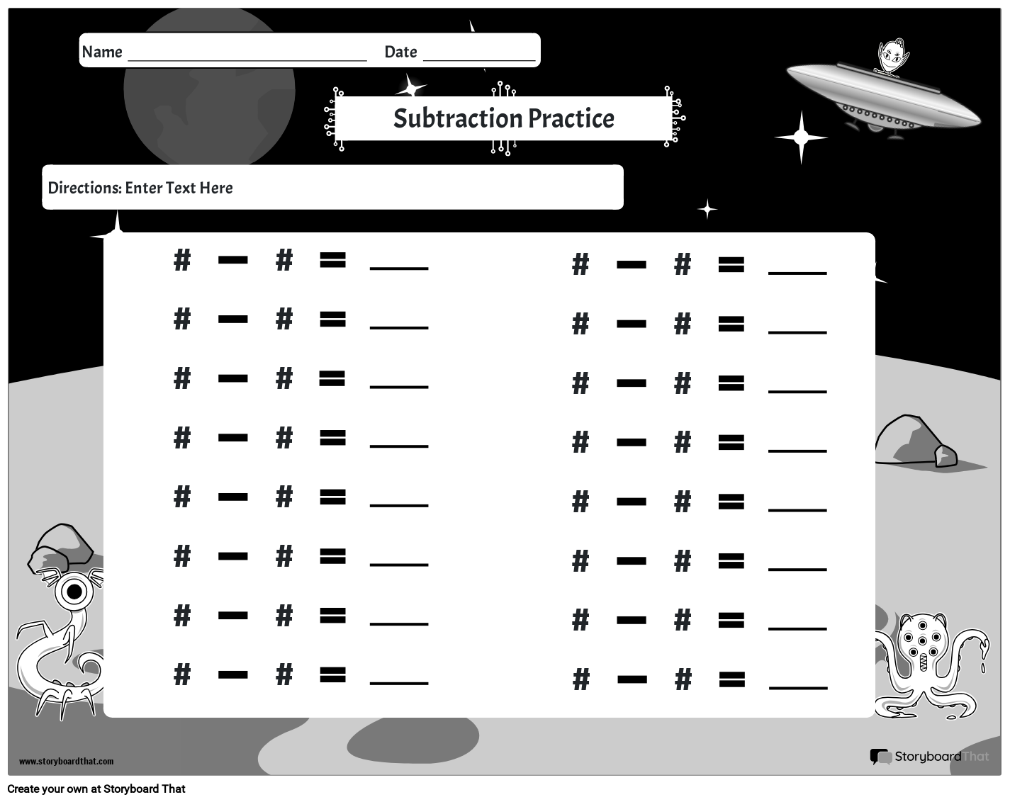 ब्लैक एंड व्हाइट एलियन थीम घटाव वर्कशीट। लैंडस्केप लेआउट।