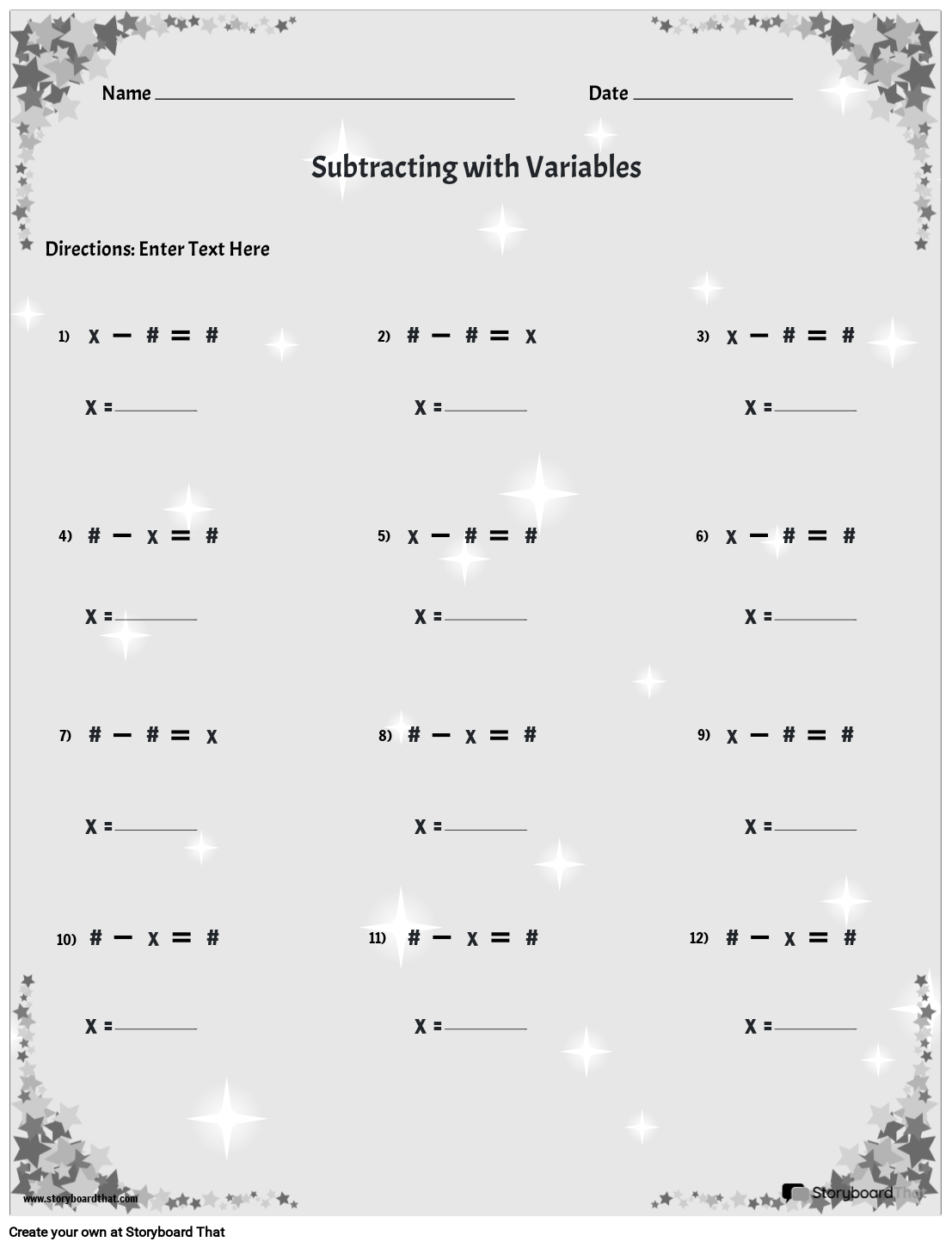 चर के साथ घटाव अभ्यास वर्कशीट। 12 प्रश्न।
