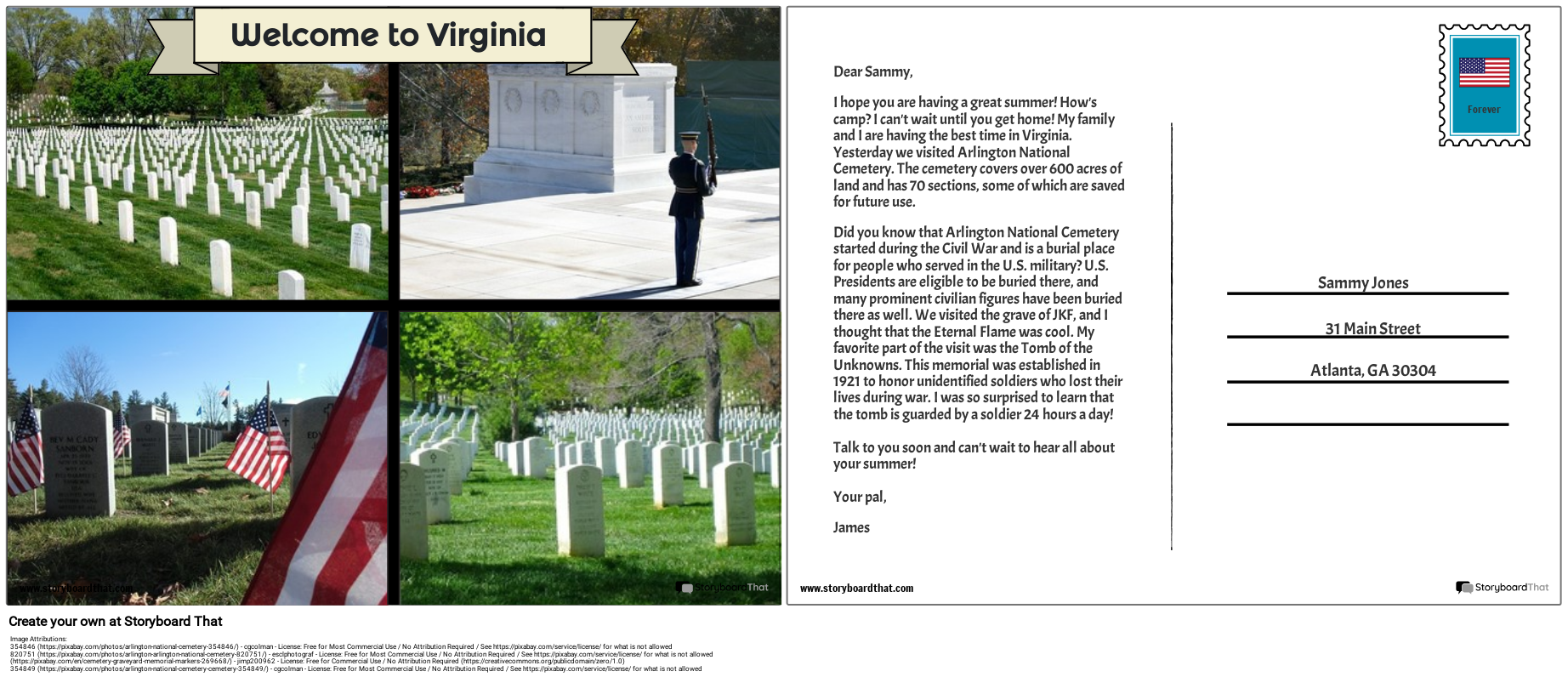 Dear Sammy,I hope you are having a great summer! How's camp? I can't wait until you get home! My family and I are having the best time in Virginia. Yesterday we visited Arlington National Cemetery. The cemetery covers over 600 acres of land and has 70 sections, some of which are saved for future use.Did you know that Arlington National Cemetery started during the Civil War and is a burial place for people who served in the U.S. military? U.S. Presidents are eligible to be buried there, and many prominent civilian figures have been buried there as well. We visited the grave of JKF, and I thought that the Eternal Flame was cool. My favorite part of the visit was the Tomb of the Unknowns. This memorial was established in 1921 to honor unidentified soldiers who lost their lives during war. I was so surprised to learn that the tomb is guarded by a soldier 24 hours a day!Talk to you soon and can't wait to hear all about your summer!Your pal,James
