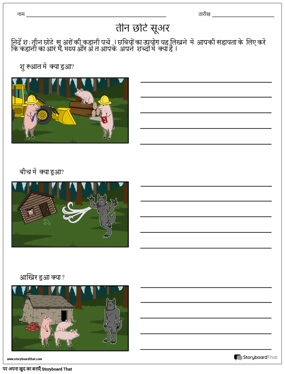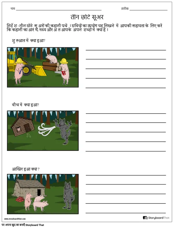 निर्देश : तीन छोटे सूअरों की कहानी पढ़ें। छवियों का उपयोग यह लिखने में आपकी सहायता के लिए करें कि कहानी का आरंभ, मध्य और अंत आपके अपने शब्दों में क्या है।