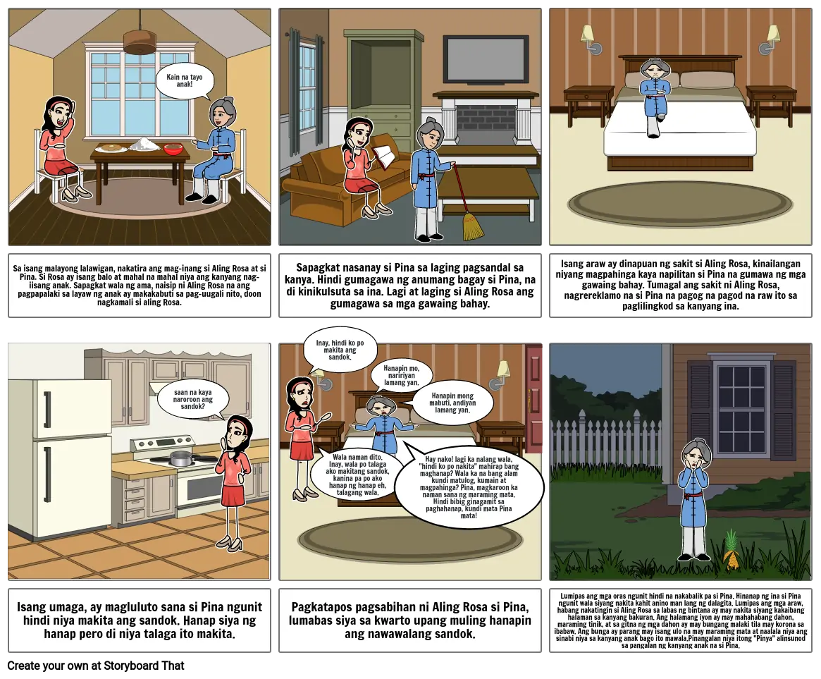 Isang araw ay dinapuan ng sakit si Aling Rosa, kinailangan niyang magpahinga kaya napilitan si Pina na gumawa ng mga gawaing bahay. Tumagal ang sakit ni Aling Rosa, nagrereklamo na si Pina na pagog na pagod na raw ito sa paglilingkod sa kanyang ina.
