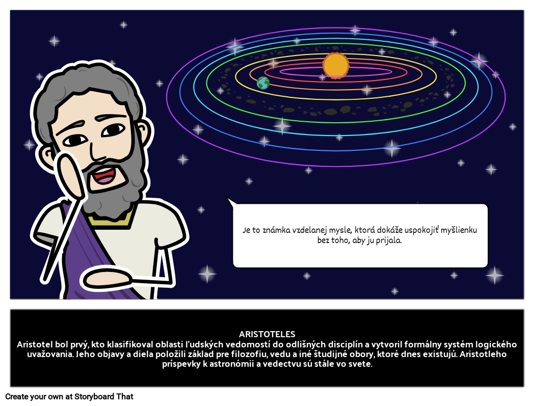 ARISTOTELESAristotel bol prvý, kto klasifikoval oblasti ľudských vedomostí do odlišných disciplín a vytvoril formálny systém logického uvažovania. Jeho objavy a diela položili základ pre filozofiu, vedu a iné študijné obory, ktoré dnes existujú. Aristotleho príspevky k astronómii a vedectvu sú stále vo svete.