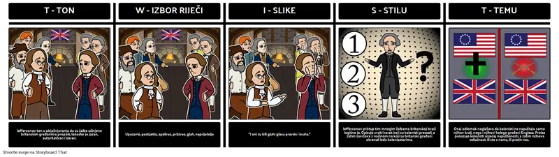 Analiza TWIST je metoda za proučavanje Ton, Odabir riječi, Slikovitost, Stil i Temu u tekstu. Kada se primijeni na Izjavu o neovisnosti, pomaže studentima dublje razumjeti Jeffersonov jezik i svrhu dokumenta razbijajući njegove književne elemente.