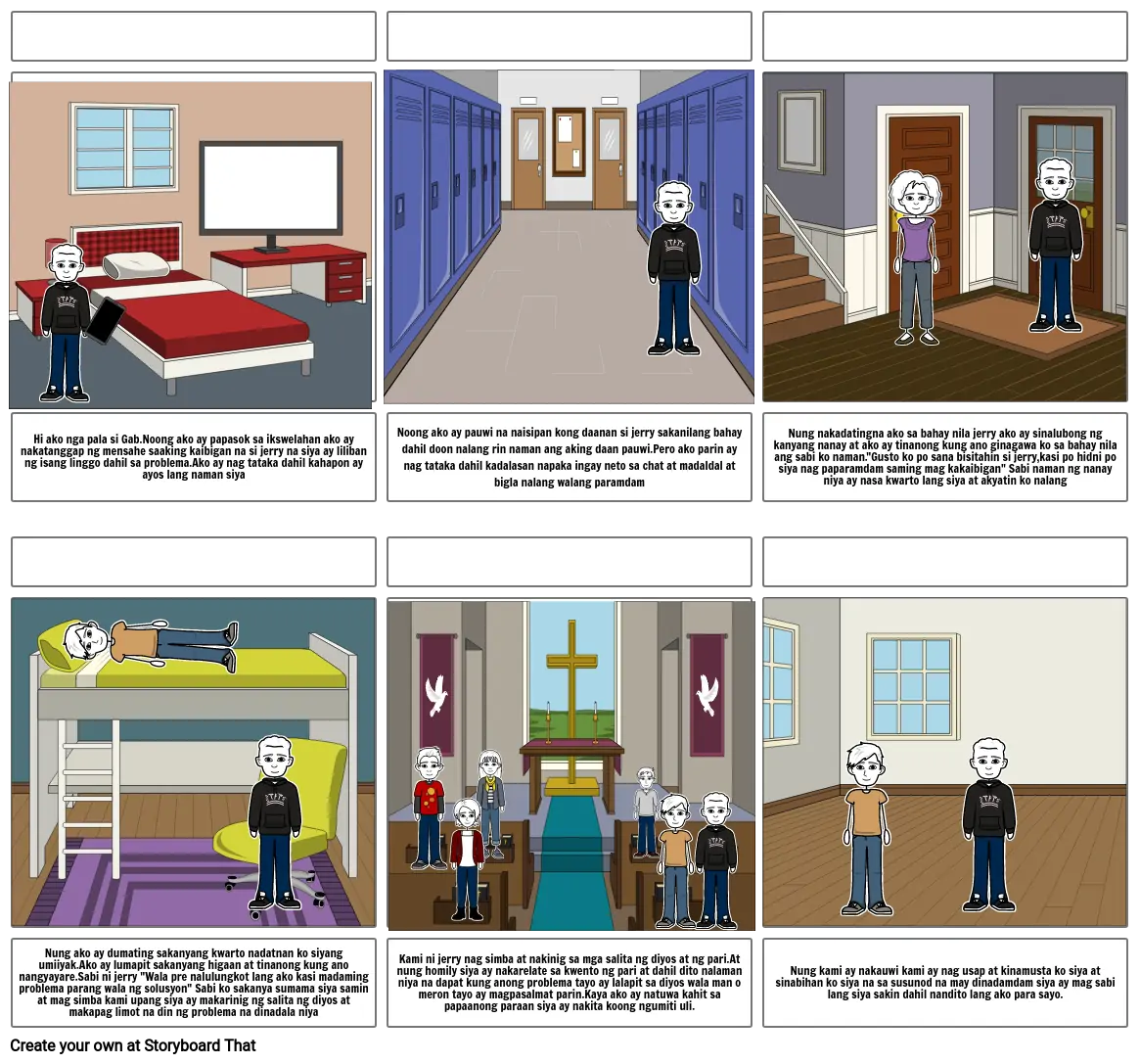 Nung ako ay dumating sakanyang kwarto nadatnan ko siyang umiiyak.Ako ay lumapit sakanyang higaan at tinanong kung ano nangyayare.Sabi ni jerry "Wala pre nalulungkot lang ako kasi madaming problema parang wala ng solusyon" Sabi ko sakanya sumama siya samin at mag simba kami upang siya ay makarinig ng salita ng diyos at makapag limot na din ng problema na dinadala niya
