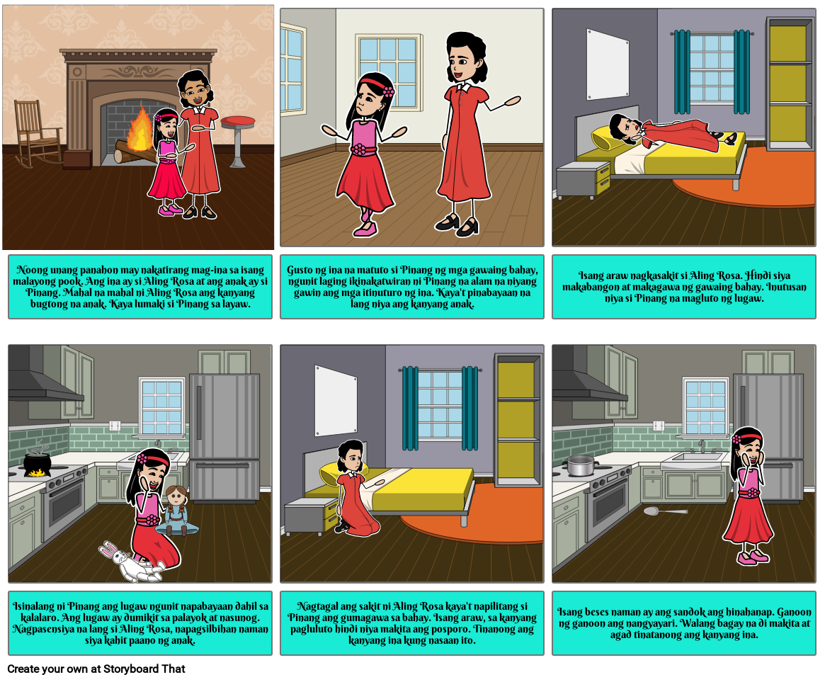Isang araw nagkasakit si Aling Rosa. Hindi siya makabangon at makagawa ng gawaing bahay. Inutusan niya si Pinang na magluto ng lugaw.