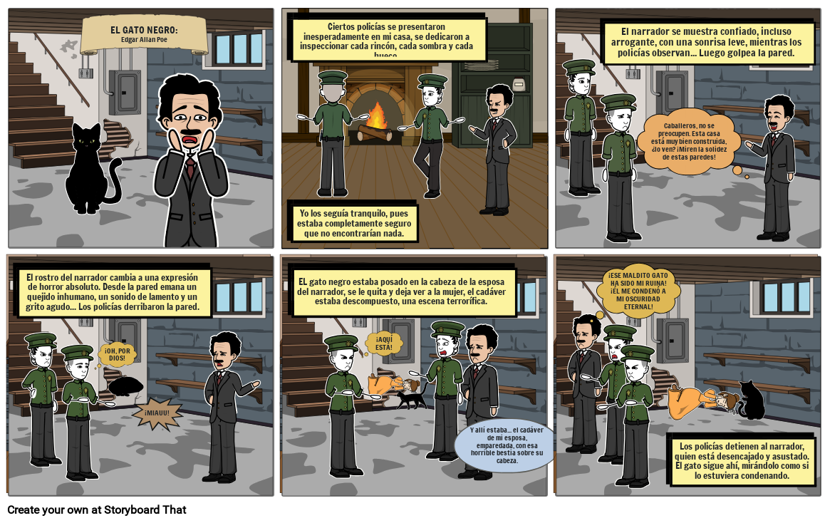Los policías detienen al narrador, quien está desencajado y asustado. El gato sigue ahí, mirándolo como si lo estuviera condenando.