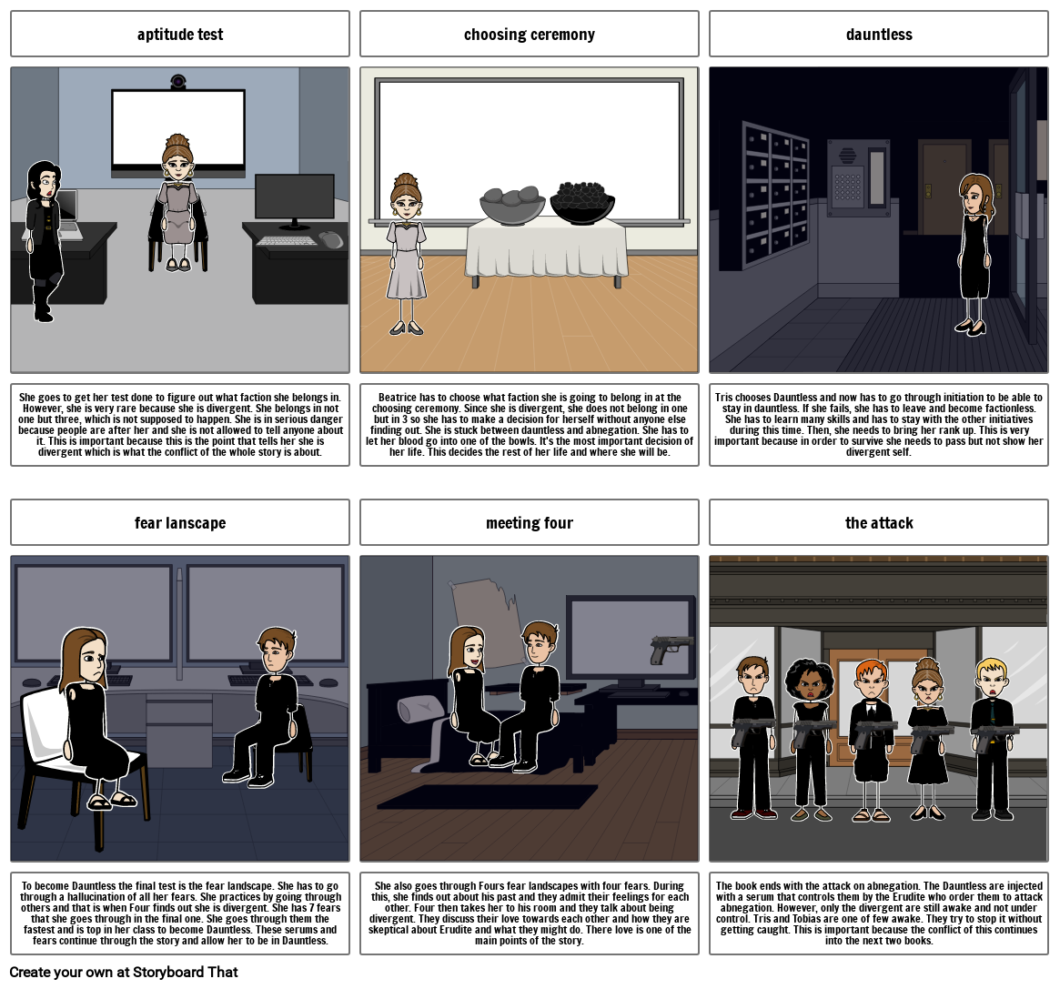 The book ends with the attack on abnegation. The Dauntless are injected with a serum that controls them by the Erudite who order them to attack abnegation. However, only the divergent are still awake and not under control. Tris and Tobias are one of few awake. They try to stop it without getting caught. This is important because the conflict of this continues into the next two books.