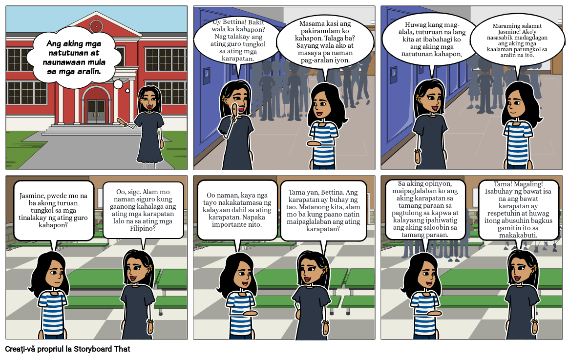 Uy Bettina! Bakit wala ka kahapon? Nag talakay ang ating guro tungkol sa ating mga karapatan.